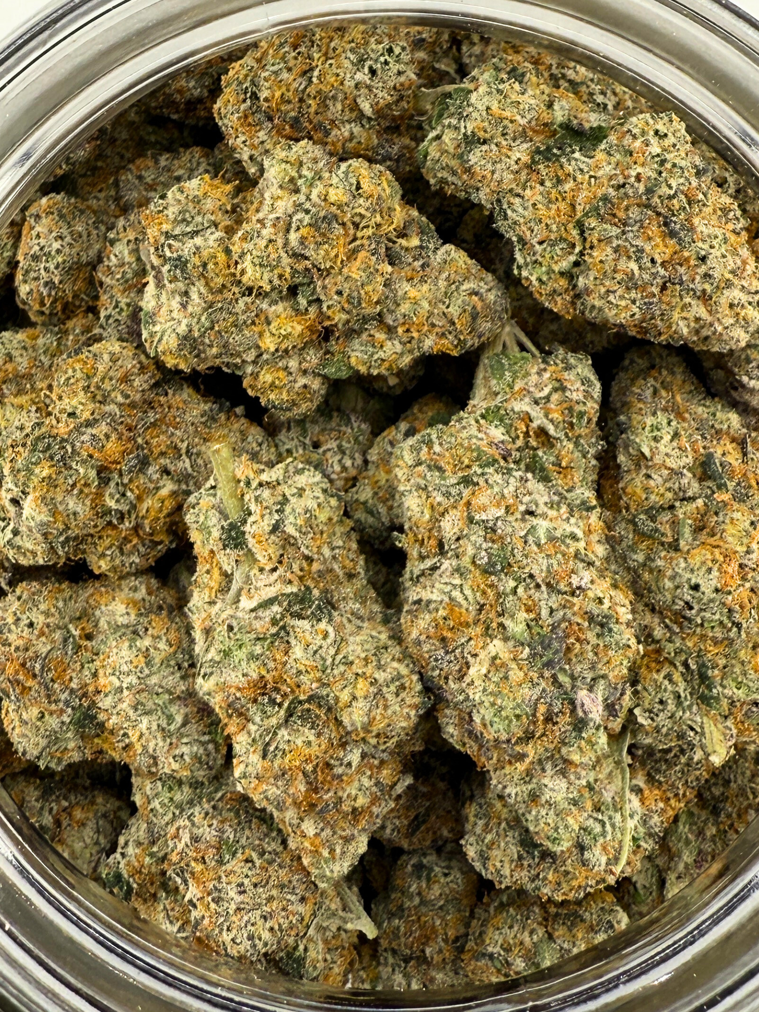 Glitterbomb is a dazzling indica-dominant hybrid that shines with bold flavor, frosty aesthetics, and deeply soothing effects. A powerful fusion of Grape Gas #10, OGKB, and Blueberry Headband, this strain leans toward relaxation, offering a euphoric body high with just enough mental clarity to keep the experience balanced. Ideal for evenings or unwinding after a long day, Glitterbomb delivers a calming yet flavorful session you’ll want to return to again and again.