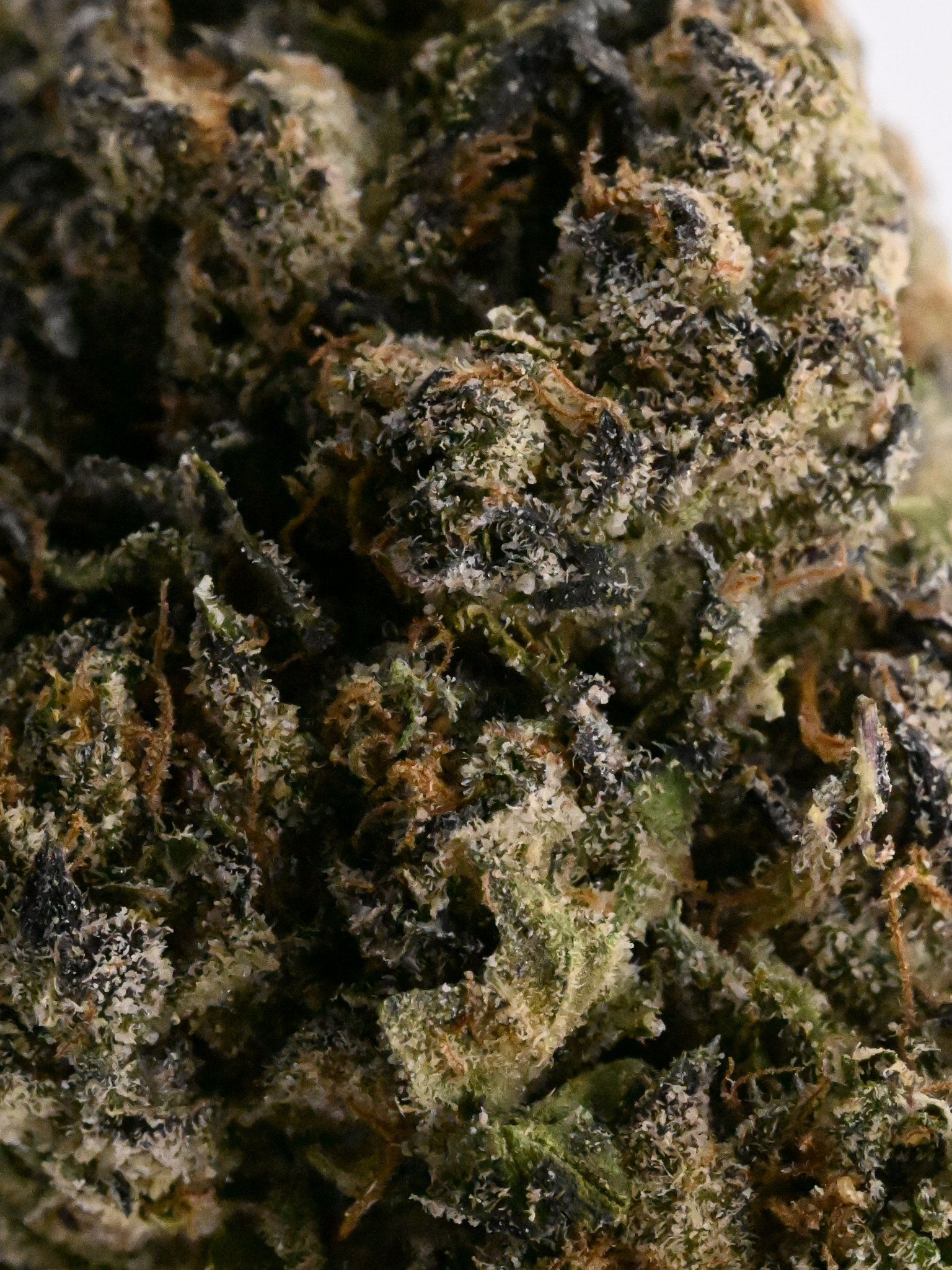 Dense, fluffy buds with emerald green color, deep blue undertones, thin orange pistils, and a thick coat of frosty, blue-tinted trichomes—a true “jar appeal” standout.
